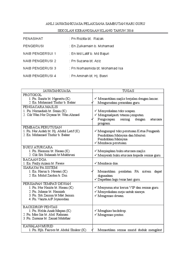 13 Julai 2020 Masa. Menyelaras memastikan semua tugasan kerja oleh AJK Sambutan Hari Guru dapat dilaksanakan sebelum semasa selepas. 23 Agar semua guru dapat diraikan Hari Guru dengan penuh meriah melalui kerjasama warga sekolah 24 Agar guru yang bersara dapat diraikan dalam majlis Sambutan Hari Guru sekolah 30 TARIKH 26 Mei 2017 40 SASARAN Semua warga SMK Cheras sesi pagi dan petang 50 AHLI JAWATANKUASA Pengerusi.